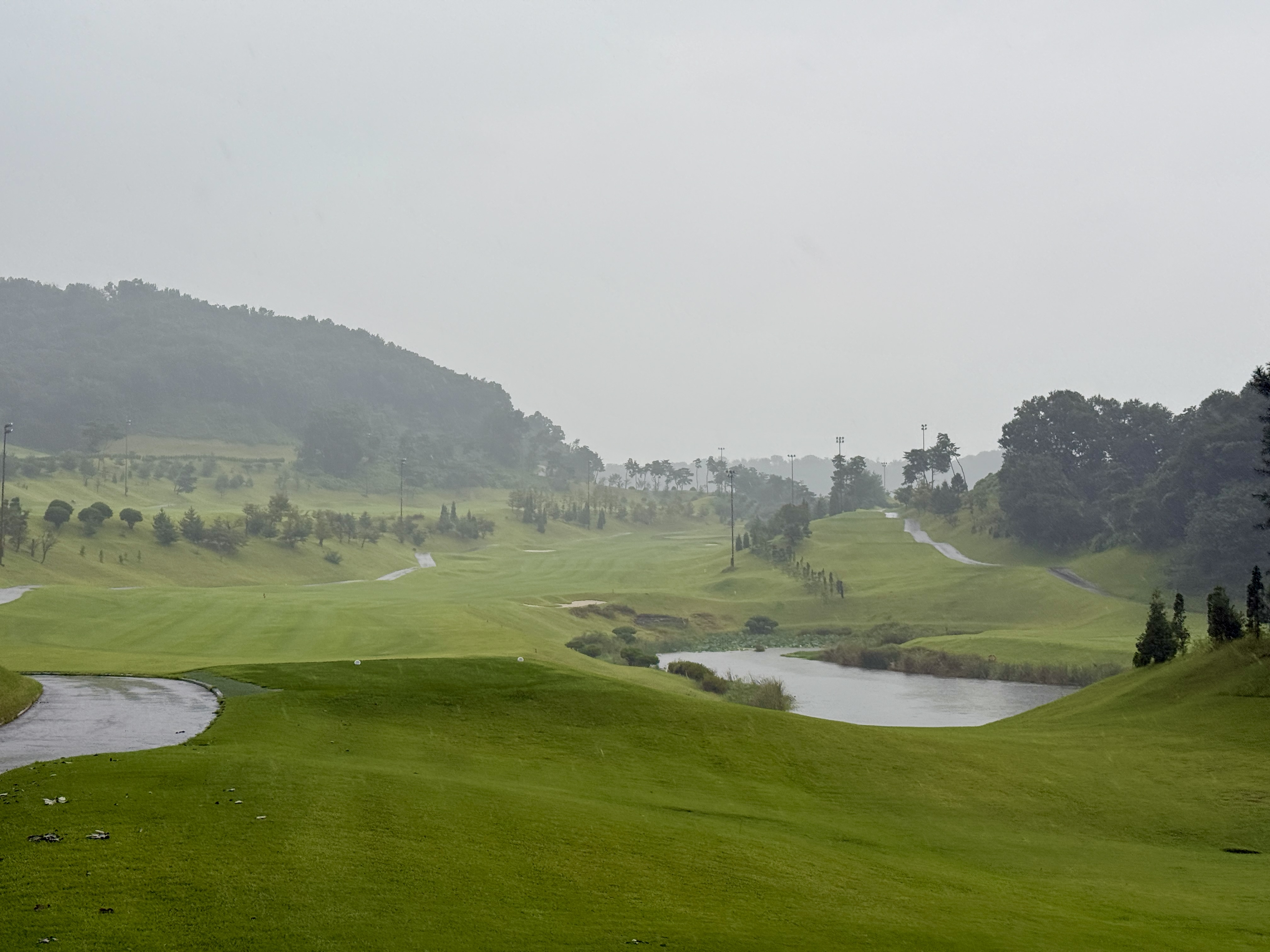 초반 홀에서는 흐리기만 하던 날씨가 4번홀부터 본격적으로 비로 바뀌었고, 9번홀에서는 그린이 잠기면서 중도 홀아웃하게 되었습니다.